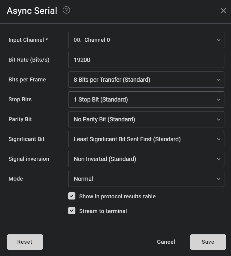 <figure><img src="https://812024329-files.gitbook.io/~/files/v0/b/gitbook-x-prod.appspot.com/o/spaces%2FS20l0nCBFmcT2JDBwjvL%2Fuploads%2Fgit-blob-216a7665390d10862a379ee9fe8ca5b66dd9de68%2Fanalyzer-settings.png?alt=media" alt="" width="375"><figcaption><p>Async Serial Analyzer settings</p></figcaption></figure>