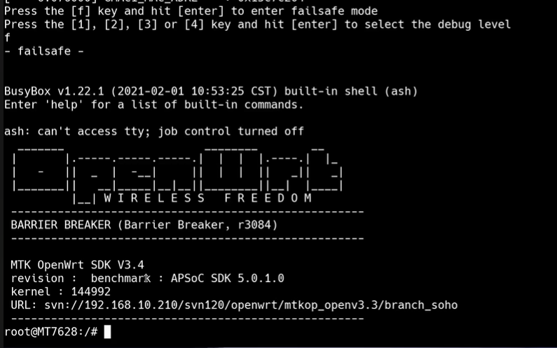 <figure><img src="https://812024329-files.gitbook.io/~/files/v0/b/gitbook-x-prod.appspot.com/o/spaces%2FS20l0nCBFmcT2JDBwjvL%2Fuploads%2Fgit-blob-64fff23c6b8c0209feb41af80a74e8db1dfb42c0%2Fimage.png?alt=media" alt=""><figcaption><p>OpenWrt command command shell</p></figcaption></figure>