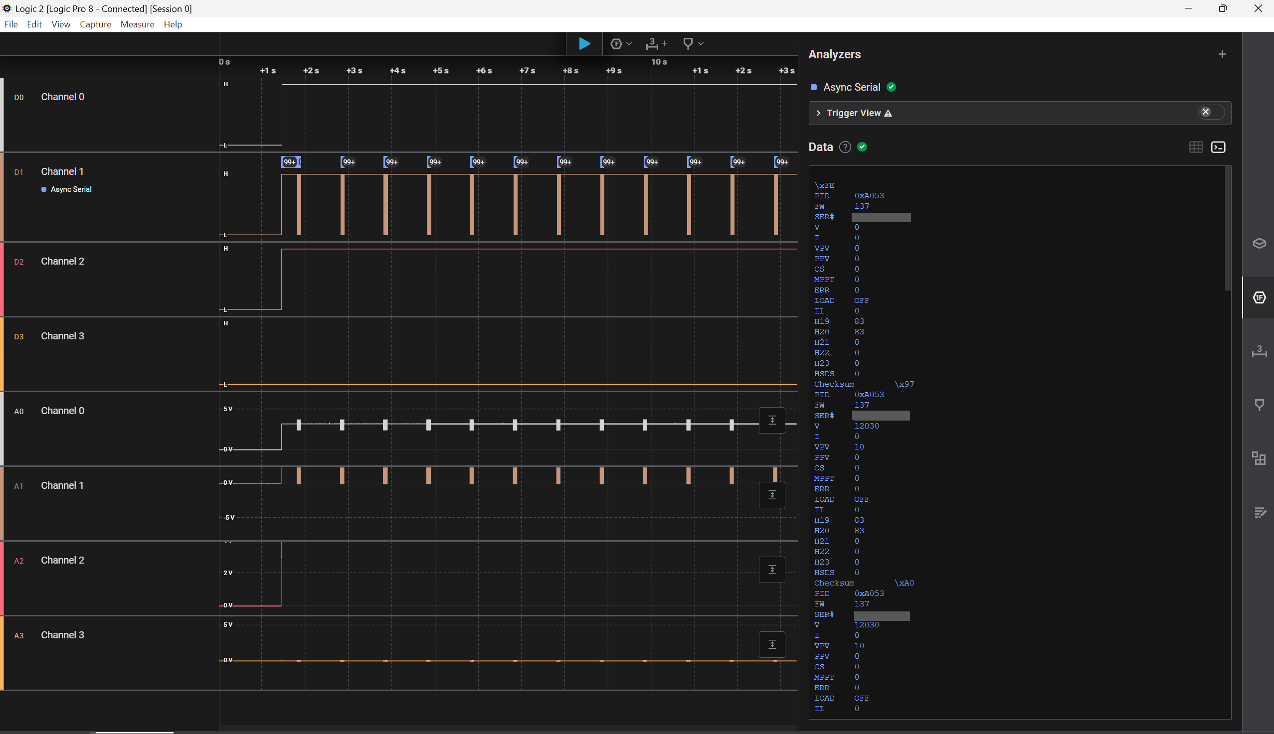 To sniff what data is send over VE.Direct we can use tools like an UART-to-TTL USB adapter or Saleae Logic Analyzer: