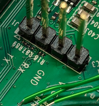 4. Now you need to connect the pins using jumper cables to the UART-USB-TTL adapter (make sure RX -> TX and TX->RX, as they have to be reversed). This can be done by soldering the cables onto the connector pins, plug them in or use clamps.